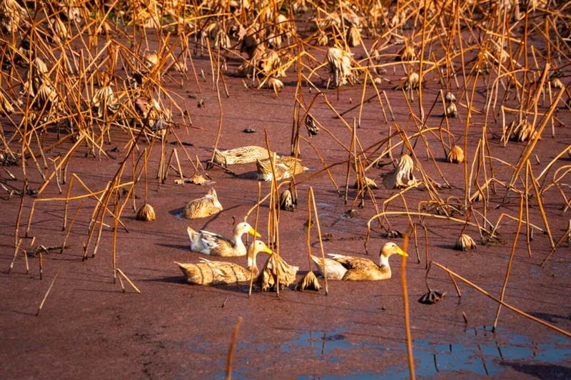 却衬得游弋的鸭鹅多了几分灵动